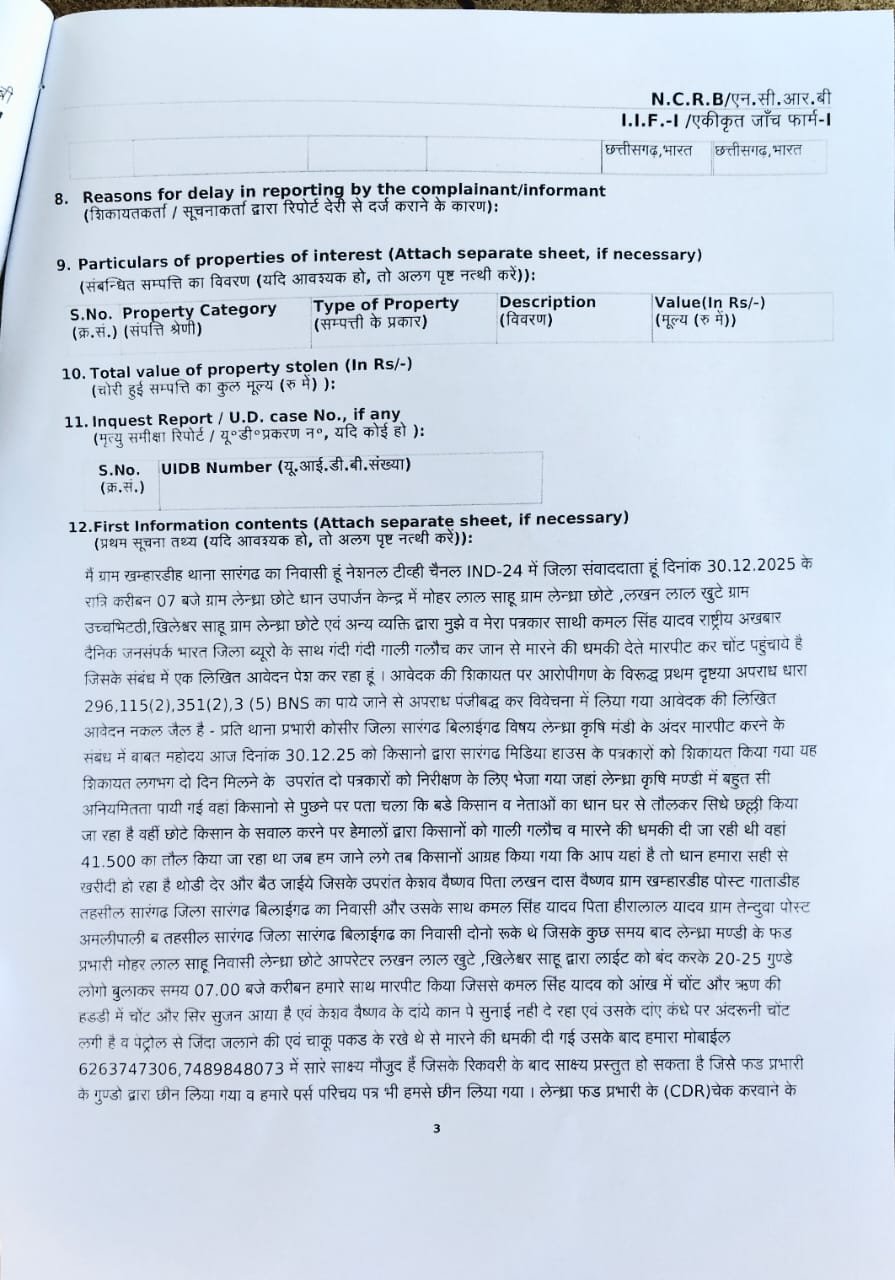 धान खरीदी केंद्र लेंधरा (छोटे) में किसानों से गाली-गलौच और अव्यवस्था की शिकायत पर न्यूज़ कवरेज करने पहुँचे पत्रकारों पर जानलेवा हमला और लूटपाट का सनसनीखेज मामला सामने आया है। पीड़ित पत्रकारों में केशव वैष्णव (नेशनल न्यूज़ चैनल IND 24) एवं कमल सिंह यादव (जनसंपर्क भारत अखबार) शामिल हैं। दोनों पत्रकारों ने घटना के संबंध में संबंधित थाने में अपराध दर्ज कराया है।