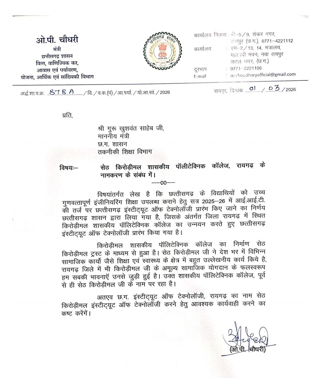 *सेठ किरोड़ीमल शासकीय पॉलीटेक्निक कॉलेज के नामकरण के संबंध में विधायक ओपी ने लिखा मंत्री सुखवंत को पत्र* – Chhattisgarh Top News