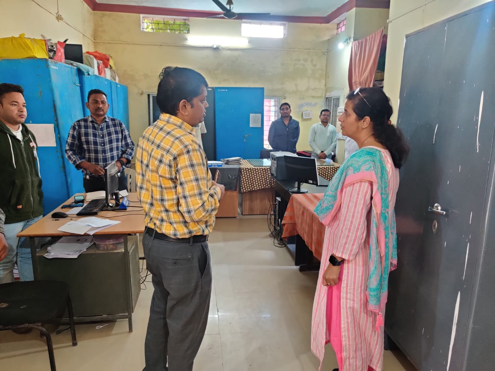 सारंगढ़-बिलाईगढ़, 22 नवम्बर 2022/ कलेक्टर डॉ.फरिहा आलम सिद्दकी ने आज बरमकेला नगर पंचायत के तहसील कार्यालय का आकस्मिक निरीक्षण किया। मौके पर तहसील के अनुपस्थित स्टॉफ पर नाराजगी जताते हुए एसडीएम को तत्काल कारण बताओ नोटिस जारी करने को कहा। इसके अलावा तहसील कार्यालय के अनेक कमरों का निरीक्षण कर जर्जर स्थिति को ठीक कराने के निर्देश दिए एवं साफ सफाई पर विशेष ध्यान देने को कहा। कलेक्टर ने खसरा, बी-1 एवं रिकॉर्ड की स्थिति, कुल राजस्व हल्के, पटवारियों की संख्या एवं नियमित पटवारी बैठक के बारे में जानकारी ली। तत्पश्चात् जनपद कार्यालय में निरीक्षण के दौरान कलेक्टर डॉ.सिद्दकी ने यहाँ भी साफ.-सफाई पर विशेष ध्यान देते हुए कहा कि आपके अपने दफ्तर की साफ -सफाई ही आपके बेहतर काम करने के लिए एक सकारात्मक माहौल तैयार करती है, सभी इस पर विशेष ध्यान दें। कलेक्टर ने राशन कार्ड बनाने की प्रक्रिया के बारे में जानकारी लेते हुए लंबित मामलों में तेजी लाने के लिए कहा, साथ ही जनदर्शन के आवेदनों पर त्वरित निपटान सुनिश्चित करने के निर्देश दिए। उक्त निरीक्षण के दौरान सारंगढ़ एसडीएम मोनिका वर्मा, बरमकेला सीईओ श्री नीलाराम पटेल, तहसीलदार श्री सिध्दांत अनंत और संबंधित विभाग के कर्मचारीगण उपस्थित रहे।