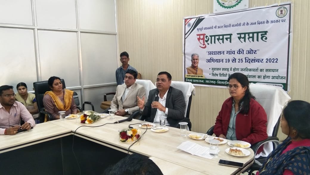 सारंगढ़-बिलाईगढ़, 23 दिसम्बर 2022/ भारत सरकार, कार्मिक, लोक शिकायत एवं पेंशन मंत्रालय के निर्देशानुसार जिला कार्यालय के सभाकक्ष में आज ‘सुशासन सप्ताह-प्रशासन गांव की ओर’ इस थीम पर कार्यशाला का आयोजन किया गया। कार्यक्रम की अध्यक्षता अपर कलेक्टर श्रीमती निष्ठा पाण्डेय तिवारी ने किया। गौरतलब है कि भारत के 75 वर्ष पूरे होने के उपलक्ष्य में आजादी का अमृत महोत्सव समारोह के अनुरूप नागरिक-केंद्रित शासन को बढ़ावा देने और सेवा वितरण में सुधार लाने में भारत सरकार के द्वारा 19 दिसंबर से 25 दिसंबर तक ‘सुशासन सप्ताह-प्रशासन गांव की ओर’ मनाया जा रहा है। इसी क्रम में आयोजित कार्यशाला में विभिन्न विभागों से प्राप्त शिकायतों और शिकायतों के निवारण की जानकारियां दी गई। इसके अलावा सभी विभाग के अधिकारियों ने जिले के बेहतर विकास के लिए अपने विचार व्यक्त किये। शासन की योजनाओं का चाहे वह ग्राम, तहसील या जिले स्तर पर हो, उन योजनाओं से लाभान्वित होने का जो वास्तविक हकदार है, उस व्यक्ति तक सही समय पर उन योजनाओं की जानकारी पहुंचे और इसके लिए प्रचार-प्रसार सुनिश्चित करने की बात कही गई।