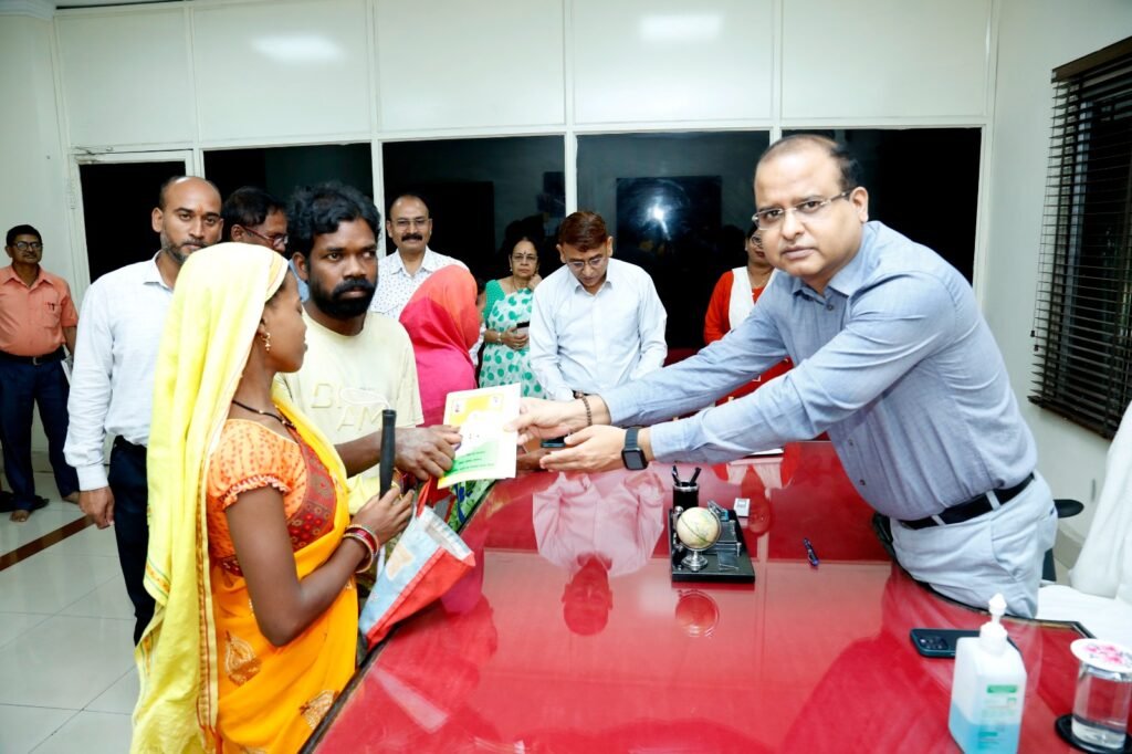 रायगढ़, 7 अगस्त 2023/ आयोजित जन चौपाल में आज ग्राम-बिरसिंघा की श्रीमती शिवमती भगत एवं उनके पति श्री गोविन्द भगत कलेक्टर श्री तारन प्रकाश सिन्हा के समक्ष अपना आवेदन लेकर जैसे ही उपस्थित हुए। कलेक्टर श्री सिन्हा अपने बेहद सरल व सौम्य अंदाज के साथ छत्तीसगढ़ बोली में उन्हें पूछा का परेशानी हे दीदी, कलेक्टर की छत्तीसगढ़ी बोली सुनकर वे भी बेझिझक सहज अंदाज में अपनी बात रखी और कहा कि में दृष्टिबाधित ह, अऊ मोला शासन के योजना के लाभ नई मिलत हे, अऊ राशन कार्ड भी नि बनिस हे ता बहुत परेशानी होत हे। कलेक्टर श्री सिन्हा ने उनकी परेशानी को देखते हुए तुरंत उन्हें अन्त्योदय अन्न योजना/विशेष कमजोर समूह का राशन कार्ड बनवाकर सौंपा एवं चलने में आसानी के लिए स्टीक प्रदान किया। इस अवसर पर आयुक्त नगर निगम श्री सुनील कुमार चंद्रवंशी, अपर कलेक्टर श्री राजीव पाण्डेय, डिप्टी कलेक्टर श्री रमेश मोर सहित अन्य जिला स्तरीय अधिकारी उपस्थित रहे।