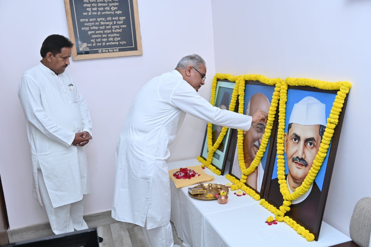 छत्तीसगढ़ टॉप न्यूज़ ,रायपुर, 02 अक्टूबर 2023/ मुख्यमंत्री  भूपेश बघेल ने आज यहाँ अपने निवास कार्यालय में राष्ट्रपिता महात्मा गांधी, पूर्व प्रधानमंत्री स्वर्गीय श्री लाल बहादुर शास्त्री और शायर हाजी हसन अली की जयंती पर उनके छायाचित्र पर पुष्प अर्पित कर उन्हें नमन किया । इस अवसर पर छत्तीसगढ़ राज्य खनिज विकास निगम के अध्यक्ष श्री गिरीश देवांगन भी उपस्थित थे ।मुख्यमंत्री बघेल ने महात्मा गांधी के देश के लिए अमूल्य योगदान को याद करते हुए कहा कि गांधी जी ने भारत में स्वाधीनता आंदोलन को नई दिशा दी। उन्होंने सत्य, प्रेम और अहिंसा का मार्ग अपनाकर पूरे विश्व के सामने मिसाल कायम की। उन्होंने देश में जिस ग्राम स्वराज की कल्पना की थी, छत्तीसगढ़ सरकार उसे पूरा करने की दिशा में आगे बढ़ रहा है।