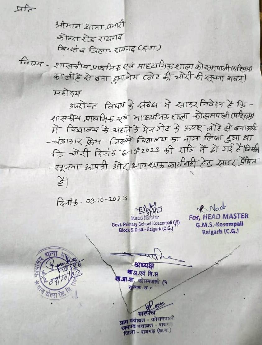 छत्तीसगढ़ टॉप न्यूज़ रायगढ़ / ग्राम पंचायत कोसमपाली के अंतर्गत शासकीय प्राथमिक एवं माध्यमिक शाला पश्चिम में विद्यालय के अहाते के मेन गेट के ऊपर लोहे से बना अर्धचंद्राकर फ्रेम जिसमे विद्यालय का नाम लिखा हुआ था, जिसे दिनाँक 06-10-2023 की रात्रि में अज्ञात चोरो ने फ्रेम को काट कर चोरी कर लिया गया है,