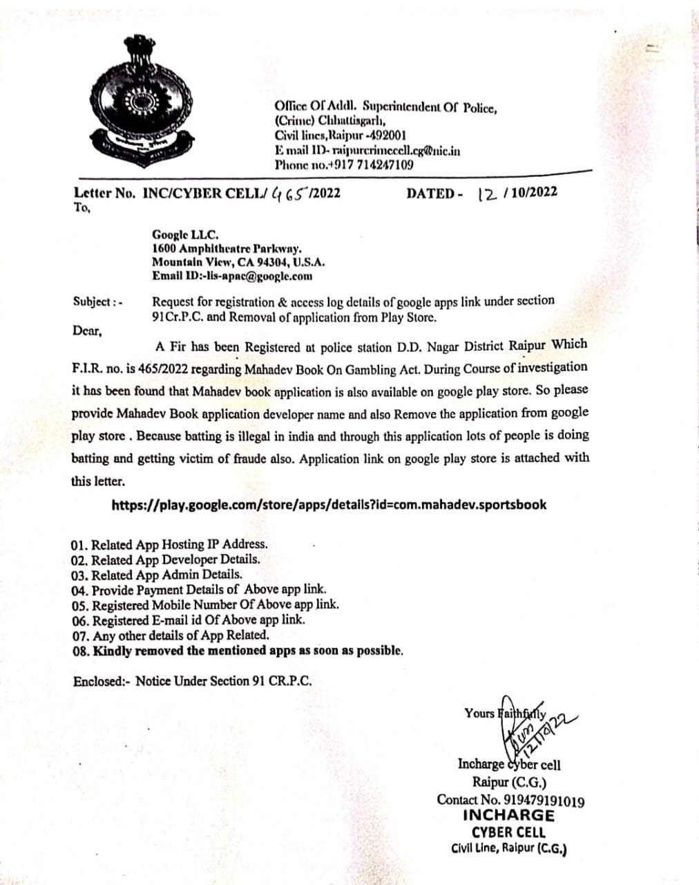 छत्तीसगढ़ टॉप न्यूज़ रायपुर/ महादेव बेटिंग ऐप्प पर कार्यवाही करते हुए वर्ष 2022 में Google को correspondence किया गया था कि playstore से Mahadev Book App को हटाया जाये, जिसके पश्चात् playstore से यह App हट गया था। दुबई से ऑपरेट कर रहे महादेव ऐप्प के मुख्य दोनों संचालकों, सौरभ चंद्राकर और रवि उप्पल को रायपुर पुलिस ने अपने यहाँ दर्ज प्रकरण में आरोपी बनाया और जून महीने में ही इन दोनों आरोपियों के विरुद्ध लुक आउट सर्कुलर भी रायपुर पुलिस द्वारा जारी करवाया गया है।