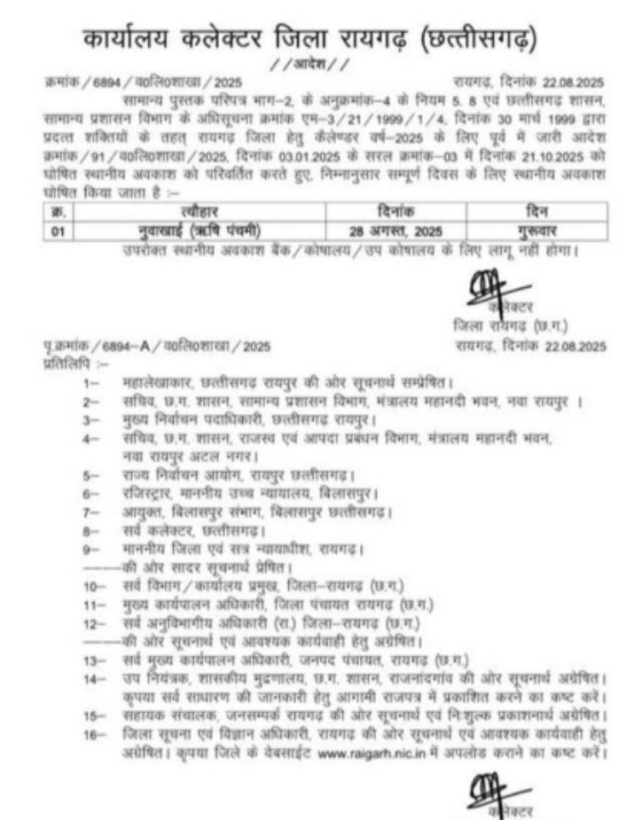 रायगढ़, 24 अगस्त 2025/ कलेक्टर श्री मयंक चतुर्वेदी ने कैलेण्डर वर्ष 2025 के लिए रायगढ़ जिले में 28 अगस्त गुरूवार को नुवाखाई (ऋषि पंचमी)के अवसर पर स्थानीय अवकाश घोषित किया है। यह अवकाश बैंक, कोषालय एवं उप कोषालय के लिए लागू नहीं होगा।