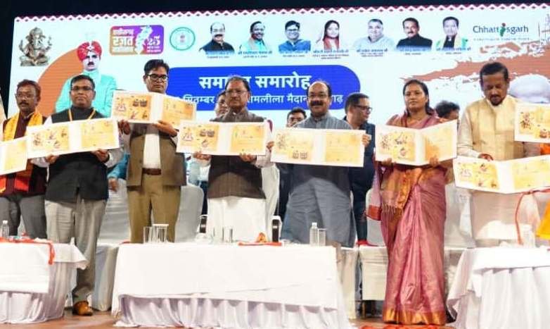 रायगढ़, 7 सितम्बर 2025/ रायगढ़ में 5 सितंबर को 40 वीं चक्रधर समारोह के समापन कार्यक्रम में मुख्यमंत्री श्री विष्णुदेव साय द्वारा चक्रधर समारोह 2025 पर विशेष आवरण एवं पिक्चर पोस्टकार्ड सेट का विमोचन किया गया। इस अवसर पर उप मुख्यमंत्री श्री अरुण साव, वित्त मंत्री श्री ओ.पी चौधरी, महिला एवं बाल विकास मंत्री श्रीमती लक्ष्मी राजवाड़े, राज्यसभा सांसद श्री देवेंद्र प्रताप सिंह, महापौर श्री जीवर्धन चौहान, डाक विभाग से श्री दिनेश कुमार मिस्त्री, निदेशक डाक सेवाएं छत्तीसगढ़ परिमंडल एवं श्री नरेंद्र राजपाल, अधीक्षक डाकघर रायगढ़ भी उपस्थित रहे।