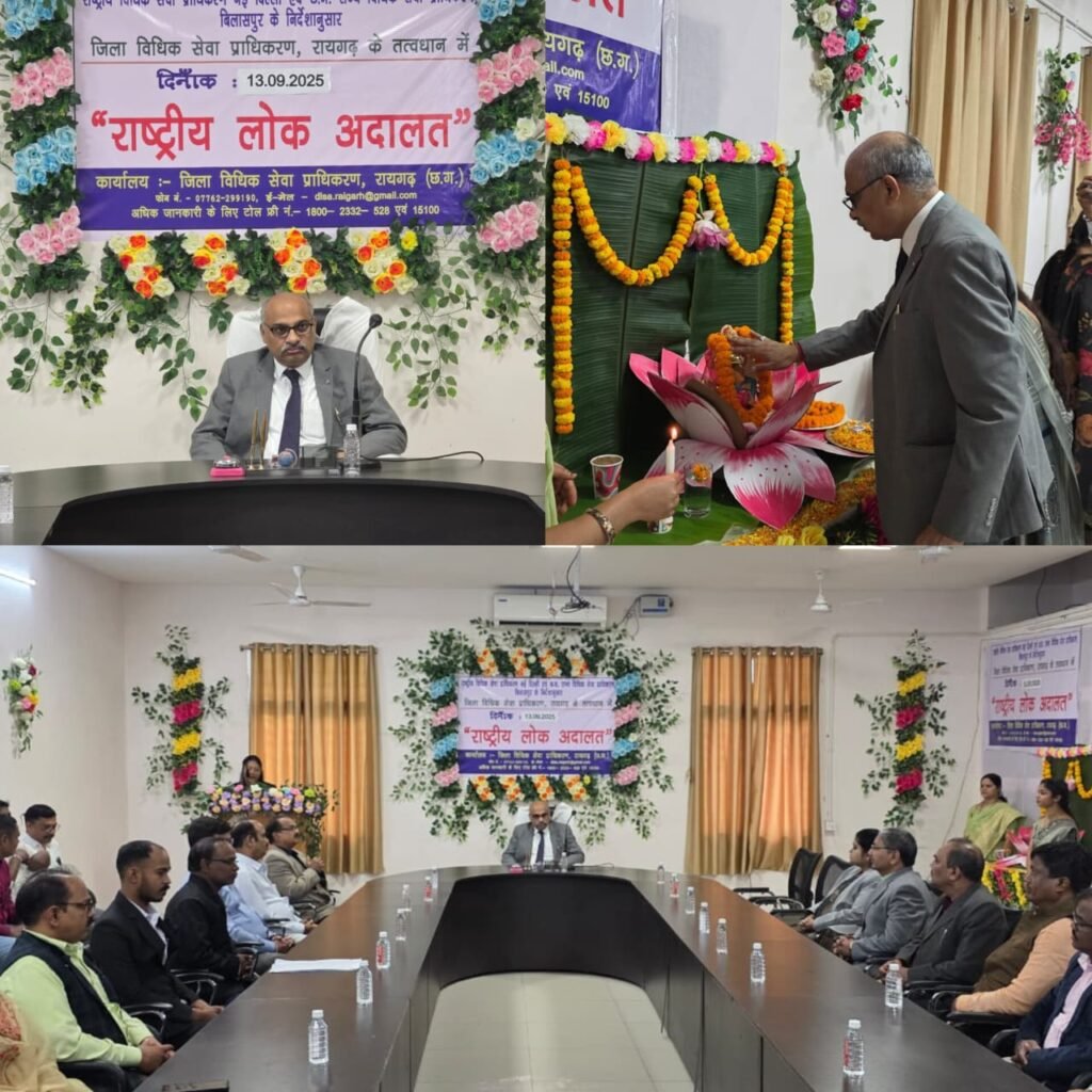 रायगढ़, 13 सितम्बर 2025/ राष्ट्रीय विधिक सेवा प्राधिकरण नई दिल्ली एवं छत्तीसगढ़ राज्य विधिक सेवा प्राधिकरण बिलासपुर के निर्देशानुसार आज रायगढ़ जिले में नेशनल लोक अदालत का आयोजन किया गया। इस अवसर पर श्री जितेन्द्र कुमार जैन, प्रधान जिला न्यायाधीश/अध्यक्ष जिला विधिक सेवा प्राधिकरण ने जिला न्यायालय रायगढ़ के न्यायालयीन सभागार में मॉ सरस्वती की प्रतिमा के समक्ष द्वीप प्रज्जवलित कर नेशनल लोक अदालत के आयोजन का शुभारंभ किया ।