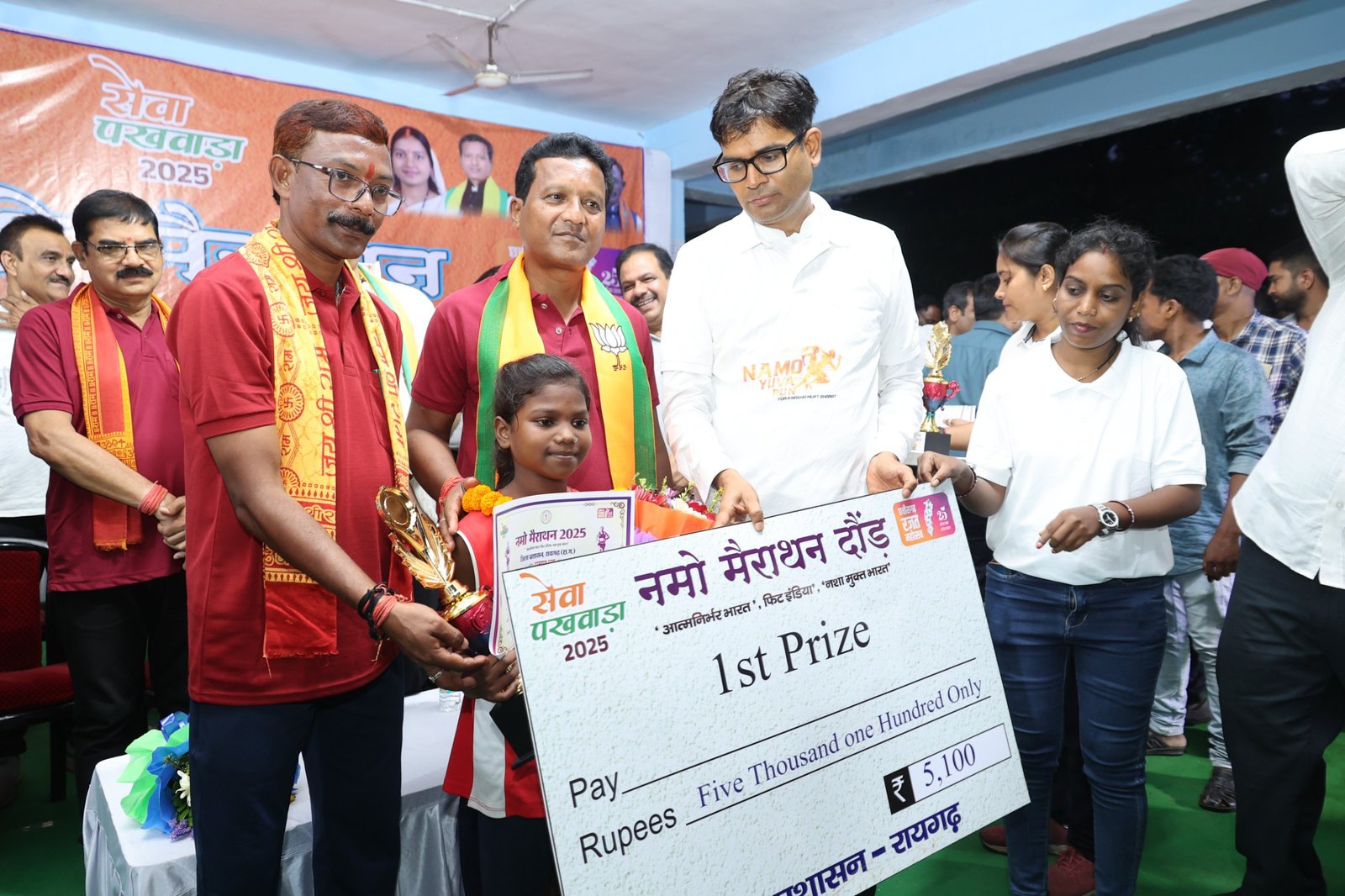 वित्त मंत्री श्री ओ.पी.चौधरी ने नमो मैराथन दौड़ के समापन में विजयी प्रतिभागियों को पुरस्कृत किया। इनमें पुरूष वर्ग में प्रथम स्थान पर मनोज कुमार यादव, द्वितीय-भोजराम साहू एवं तृतीय स्थान पर सुनील कुमार साहू रहे। इसी तरह महिला वर्ग में प्रथम स्थान पर सोना चौहान, द्वितीय-संगीता यादव एवं तृतीय स्थान पर धनकुवर सिदार रही। प्रथम आने वाले प्रत्येक प्रतिभागी को 5100 रूपए, द्वितीय को 3100 रुपए एवं तृतीय स्थान पर रहे प्रतिभागियों को 2100 रुपए दिए गए। इसी तरह बालक और बालिका वर्ग से प्रथम दस स्थानों पर आने वाले प्रतिभागियों को वित्त मंत्री श्री ओ.पी.चौधरी ने 5-5 हजार रूपये देने की घोषणा की।