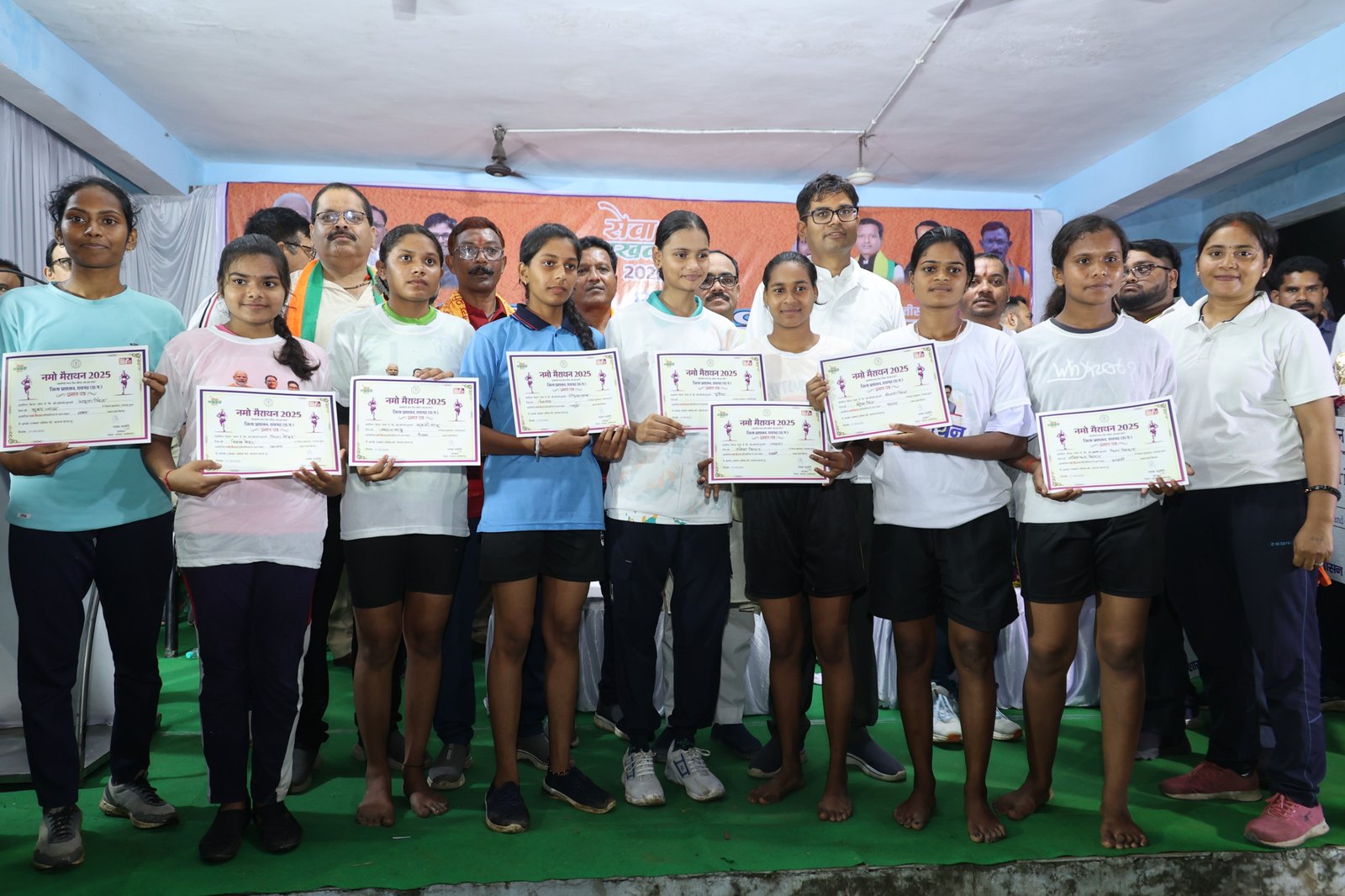 वित्त मंत्री श्री ओ.पी.चौधरी ने नमो मैराथन दौड़ के समापन में विजयी प्रतिभागियों को पुरस्कृत किया। इनमें पुरूष वर्ग में प्रथम स्थान पर मनोज कुमार यादव, द्वितीय-भोजराम साहू एवं तृतीय स्थान पर सुनील कुमार साहू रहे। इसी तरह महिला वर्ग में प्रथम स्थान पर सोना चौहान, द्वितीय-संगीता यादव एवं तृतीय स्थान पर धनकुवर सिदार रही। प्रथम आने वाले प्रत्येक प्रतिभागी को 5100 रूपए, द्वितीय को 3100 रुपए एवं तृतीय स्थान पर रहे प्रतिभागियों को 2100 रुपए दिए गए। इसी तरह बालक और बालिका वर्ग से प्रथम दस स्थानों पर आने वाले प्रतिभागियों को वित्त मंत्री श्री ओ.पी.चौधरी ने 5-5 हजार रूपये देने की घोषणा की।