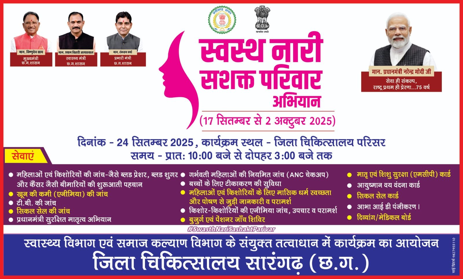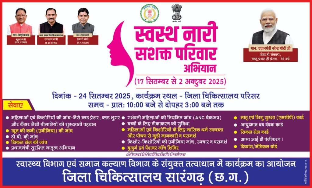 सारंगढ़ बिलाईगढ़, 23 सितंबर 2025/ जिला अस्पताल सारंगढ़ में प्रत्येक बुधवार को सुबह 10 बजे से मेडिकल और दिव्यांग बोर्ड का आयोजन किया जा रहा है। इसी सिलसिले में प्रत्येक पहले और चौथे बुधवार को बच्चों के शिशु रोग और आंखों के नेत्र रोग का दिव्यांगता प्रमाण पत्र बनाया जाता है। इसी हॉस्पिटल में सेवा पखवाड़ा अंतर्गत स्वस्थ नारी सशक्त परिवार अभियान में महिला संबंधी लगभग सभी प्रकार के बीमारियों का इलाज किया जाएगा।