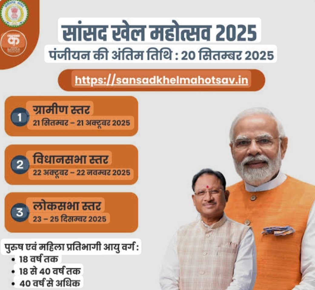 रायगढ़, 1 अक्टूबर 2025/ युवाओं के खेल कौशल को मंच देने और फिट इंडिया मूवमेंट को बढ़ावा देने के उद्देश्य से सांसद खेल महोत्सव 2025 का आयोजन इस वर्ष 25 दिसंबर 2025 तक किया जाएगा। यह आयोजन ग्रामीण स्तर से लेकर संसदीय क्षेत्र स्तर तक होगा, जिसमें विभिन्न खेल प्रतियोगिताओं का आयोजन किया जाएगा। सांसद खेल महोत्सव में भाग लेने वाले इच्छुक प्रतिभागी ऑनलाईन पोर्टल http://www.sansadkhelmahotsav.in पर लॉग इन कर अपने पसंदीदा खेल का चयन करते हुए 27 अक्टूबर तक अपना पंजीयन कर सकते है।