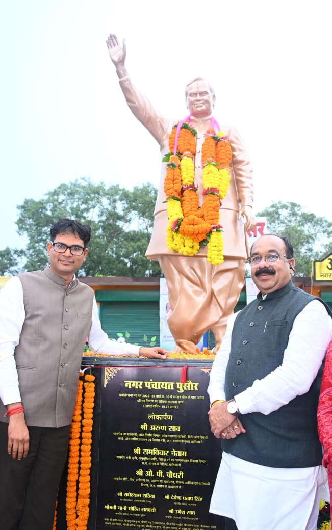 रायगढ़, 6 अक्टूबर 2025/ बरसात के बीच भी नगर पंचायत पुसौर में आज विकास के प्रति नागरिकों का उत्साह देखते ही बन रहा था। यह अवसर था 15 करोड़ 31 लाख रुपये की लागत के विभिन्न विकास कार्यों के लोकार्पण एवं शिलान्यास का। इस अवसर पर उप मुख्यमंत्री श्री अरुण साव एवं वित्त मंत्री श्री ओ.पी. चौधरी मुख्य अतिथि के रूप में उपस्थित रहे। उन्होंने नगर पंचायत पुसौर के बाजार चौक में 19.78 लाख रुपये की लागत से अटल परिसर निर्माण व भारत रत्न एवं पूर्व प्रधानमंत्री स्वर्गीय श्री अटल बिहारी वाजपेयी की आदमकद प्रतिमा का अनावरण किया तथा राष्ट्र निर्माण में उनके अमूल्य योगदान को नमन किया।