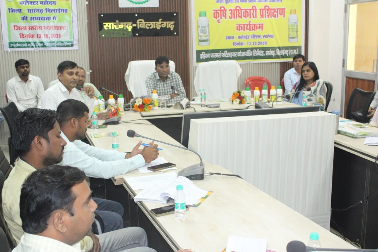 सारंगढ़ बिलाईगढ़, 14 अक्टूबर 2025/ कृषि कार्यशाला सह प्रशिक्षण कलेक्टर सभाकक्ष सारंगढ़ में आयोजित किया गया। इस समीक्षा बैठक में प्रकाश सर्वे अपर कलेक्टर, मधु गबेल डिप्टी कलेक्टर, आशुतोष श्रीवास्तव उप संचालक, दिनेश गाँधी स्टेट हेड इफको कंपनी, भूपेंद्र पाटीदार जिला प्रतिनिधि, शारदा पैकरा बीज निगम प्रक्रिया प्रभारी वरिष्ठ कृषि विकास अधिकारी, सारंगढ़, बिलाईगढ़ एवं बरमकेला के कृषि विकास अधिकारी एवं समस्त ग्रामीण कृषि विकास अधिकारी उपस्थित हुए। इस कार्यशाला सह प्रशिक्षण में दिनेश गाँधी द्वारा नैनो यूरिया एवं नैनो डीएपी के उपयोग एवं महत्त्व के विषय प्रशिक्षण दिया गया। प्रधानमंत्री किसान सम्मान निधि, एग्रीस्टेक पोर्टल में कृषक पंजीयन, धान खरीदी कृषकों कैरी फारवर्ड, वन पट्टाधारी कृषकों के सत्यापन, ग्रीष्मकालीन धान का रकबा कम कर दलहन तिलहन एवं अन्य उद्यानिक फसले बोने की रणनीति, बीज उत्पादन कार्यक्रम, फसल कटाई प्रयोग एवं अन्य समसामयिक विषयों पर प्रकाश सर्वे अपर कलेक्टर द्वारा समीक्षा लिया गया।