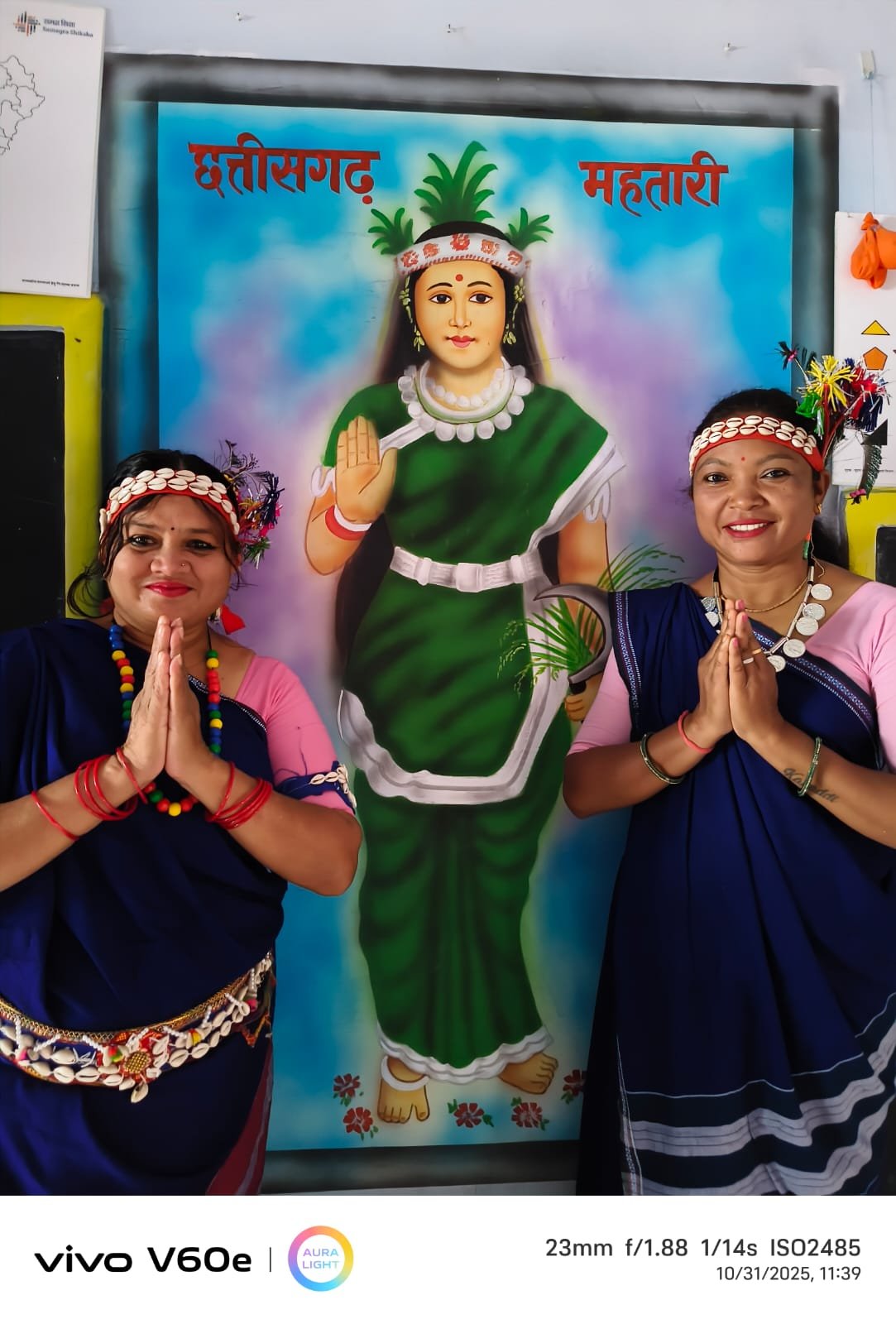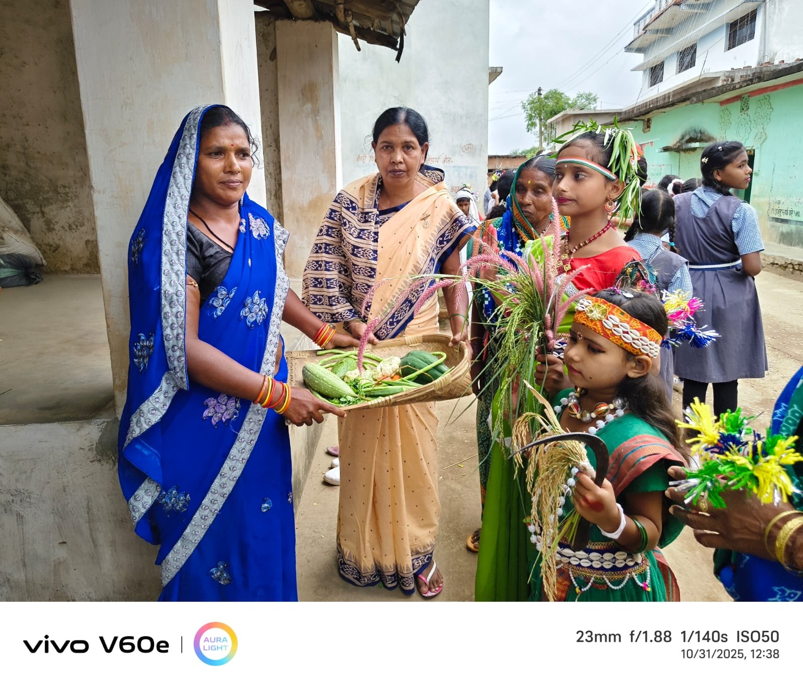 तत्पश्चात पूरे गांव में प्रत्येक घरों के सामने छत्तीसगढ़ से संबंधित रंगोली सजाई गई थी।कहीं चावल आटे का तो कहीं धान का चौक पूर कर प्रत्येक घरों में कलश ,रख कर छत्तीसगढ़ी माता का द्वार द्वार पूजा अर्चना की गई। साथ में छत्तीसगढ़ की संस्कृति व कृषि परंपरा को प्रदर्शित करते हुये ग्रामीणों ने धान, चावल, उड़द, मूंग,मूंगफली, भूट्टा,झुनगा,चना, सरसो, कोंचई-कांदा, रखिया, मखना, लौकी और छत्तीसगढ़ में उगाई जाने वाली फलों, सब्जियां का दान किया गया।