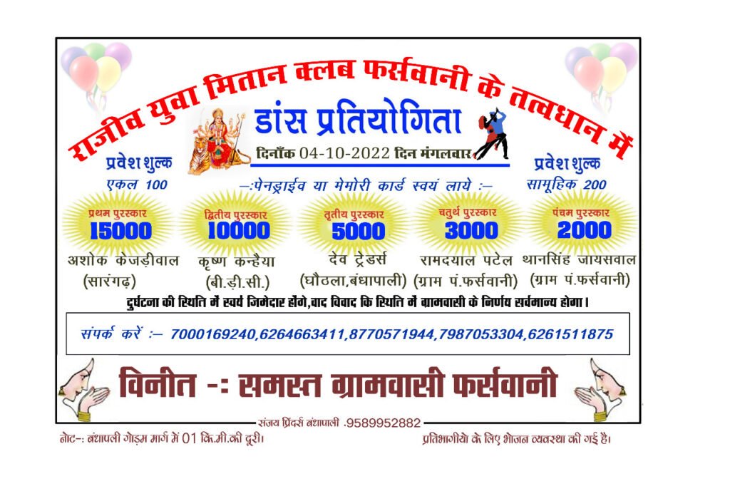 ग्राम पंचायत फर्सवानी (सारंगढ़) मे 4 अक्टूबर मंगलवार को होगा रात्रिकालीन ओपन चैलेंज डांस प्रतियोगिता...कलाकारों पर इनामों की होगी बौछार,...