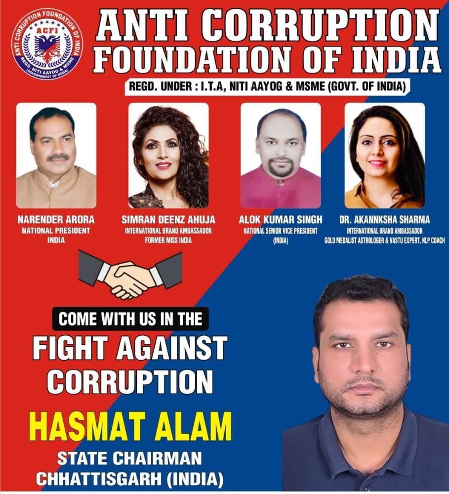 भिलाई:- ट्रैक सी जी न्यूज के प्रधान संपादक हशमत आलम बने एंटी करप्शन फाउंडेशन ऑफ इंडिया छत्तीसगढ़ इकाई के स्टेट...